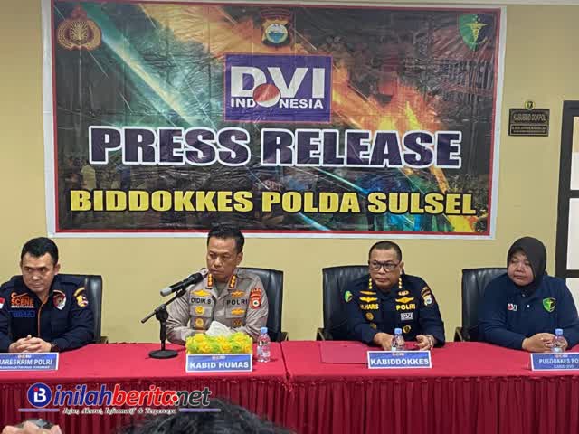Konferensi Pers tersebut dipimpin langsung oleh Kabid Humas Polda Sulsel Kombes Pol. Didik Supranoto, S.I.K., M.H., didampingi Kabiddokkes Polda Sulsel, perwakilan Pusdokkes Polri selaku Kabid DVI, serta perwakilan Bareskrim Polri melalui Kabiddaktikkrim Pusident.