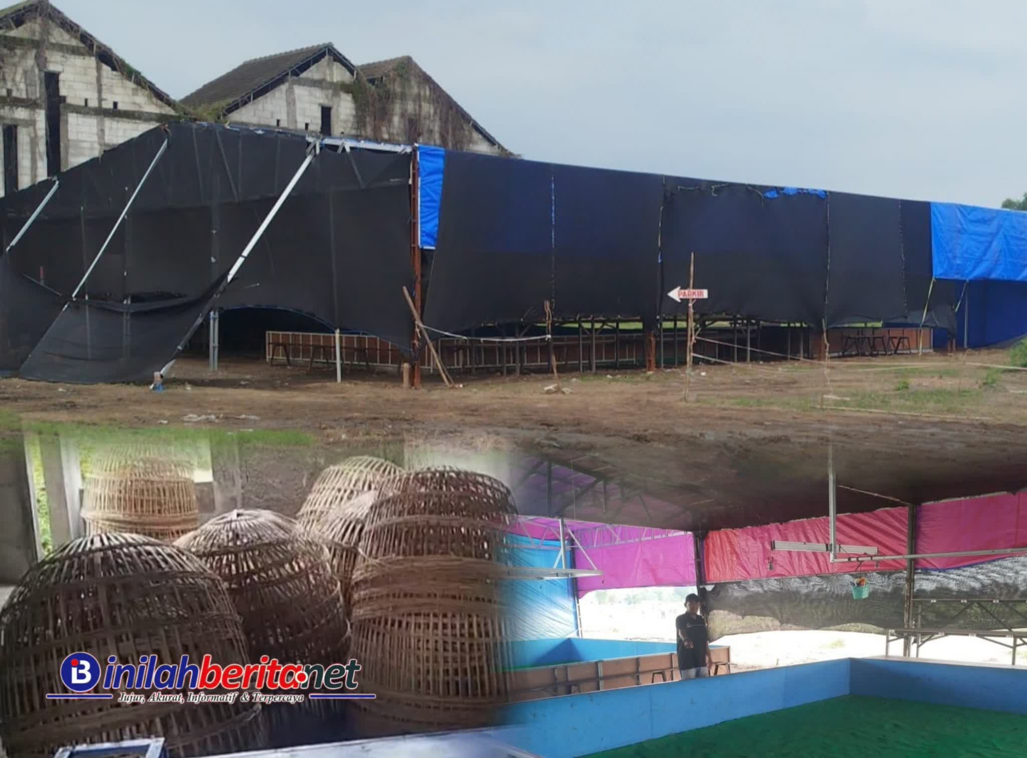 Pantauan di lokasi menunjukkan arena sabung ayam menggunakan konstruksi kanopi besi tertutup terpal biru. Di dalamnya, panitia menyiapkan tiga gelanggang beralas karpet hijau lengkap dengan kursi besi yang tersusun rapi mengelilingi arena. Struktur bangunan terlihat lebih kokoh dan terorganisir dibanding sebelumnya.