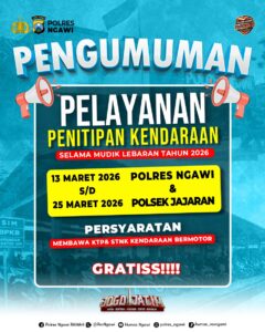 “Masyarakat yang akan mudik dapat menitipkan kendaraan bermotor di Polres Ngawi maupun Polsek jajaran. Layanan ini kami sediakan untuk membantu masyarakat agar mudik lebih aman dan nyaman,” ujarnya, Minggu (15/3/2026)